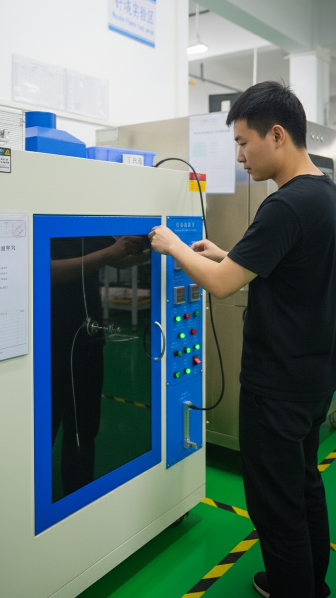 It’s used in flammability testing of materials, particularly plastics, insulation, and electronic components. The machine applies a small needle-shaped flame to the sample for a controlled time and angle, simulating how materials might ignite when exposed to small flames or sparks in real-world conditions.