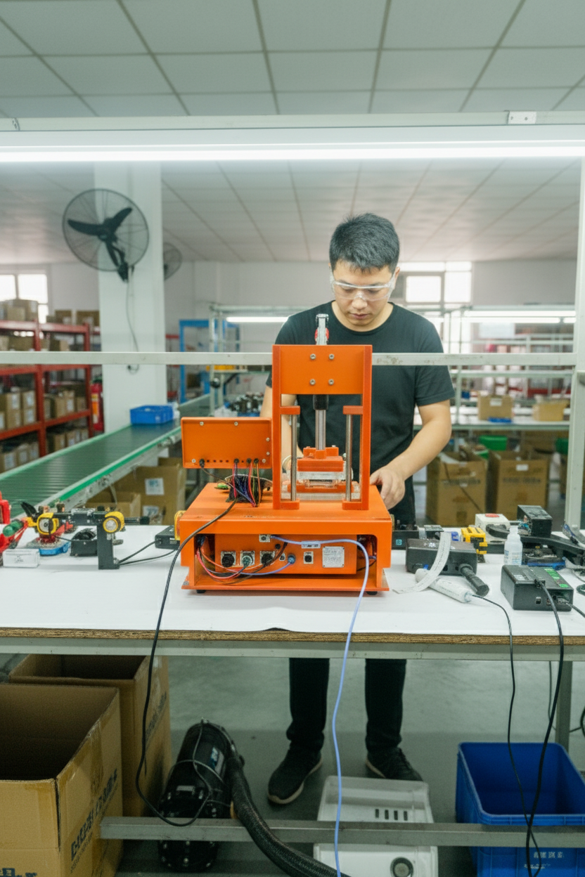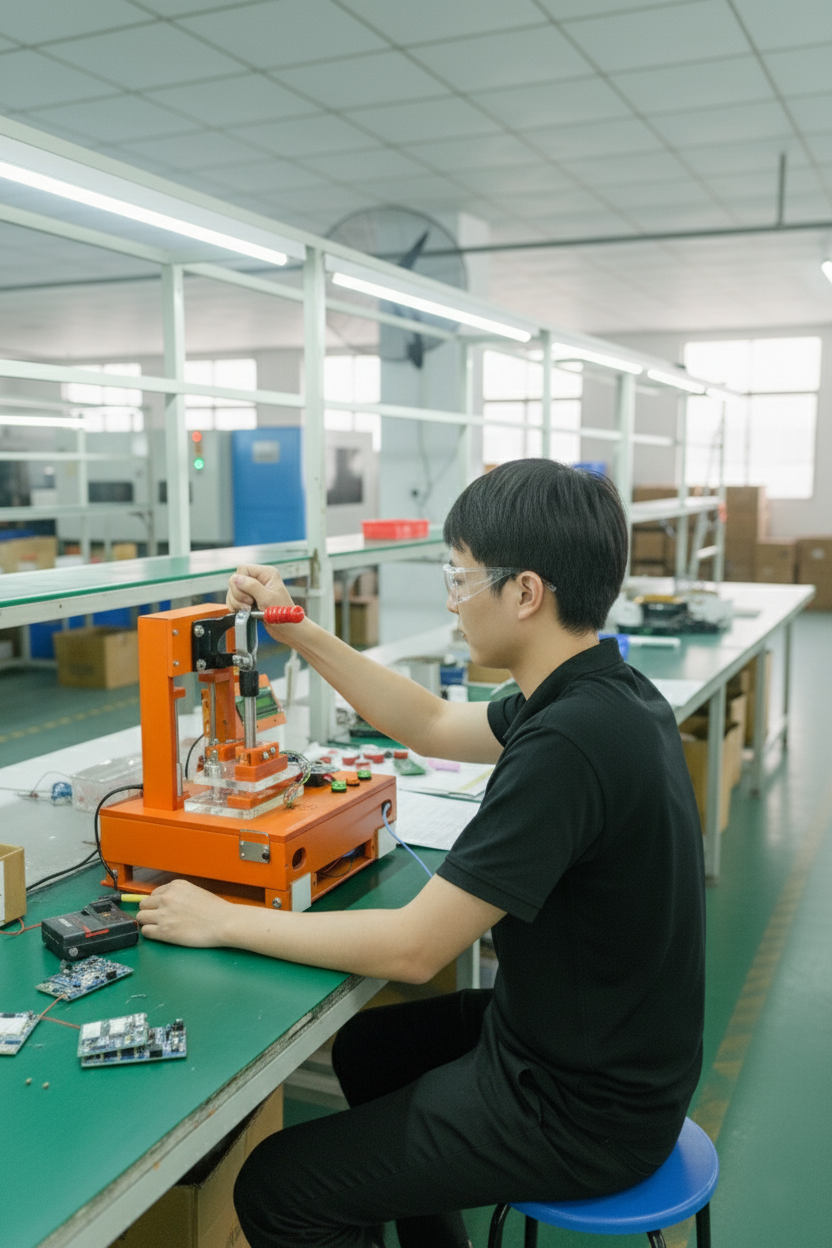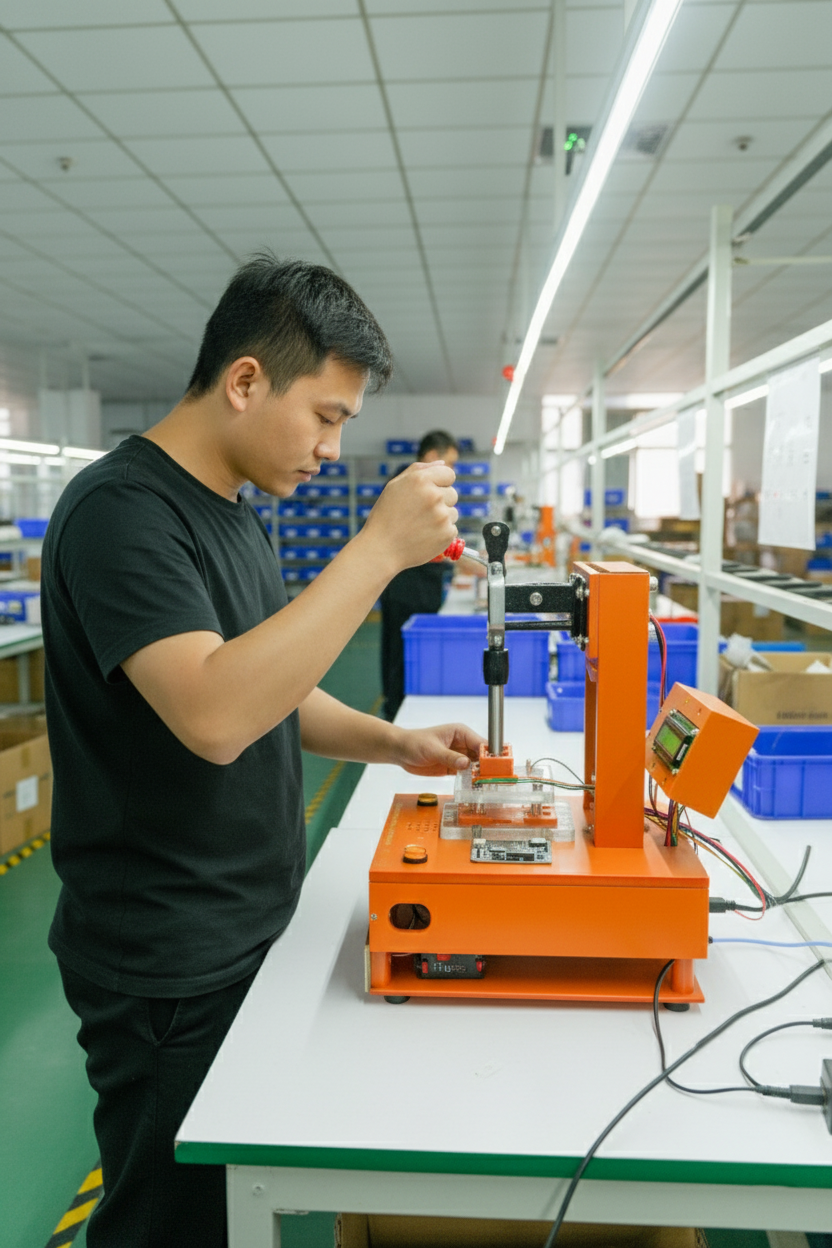 It is used in electronics manufacturing to test assembled circuit boards (PCBAs). The board under test is placed into the fixture, and the top handle presses it down so that spring-loaded test pins (pogo pins) make contact with specific test points on the board. The buttons and small display on the front are used to operate the test procedure, while the connected wiring links the board to measurement instruments or microcontrollers that check signals, voltages, and communication functions.
